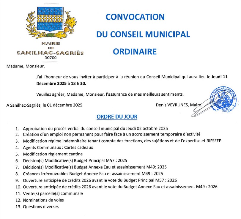 Convocation au Conseil Municipal ordinaire du jeudi 11 décembre 2025 par Julien Cuny | Déc 1, 2025 | Actu à la une, Convocation CM, les conseils municipaux, Mairie 2025 Convocation Conseil municpal du jeudi 11.12.2025