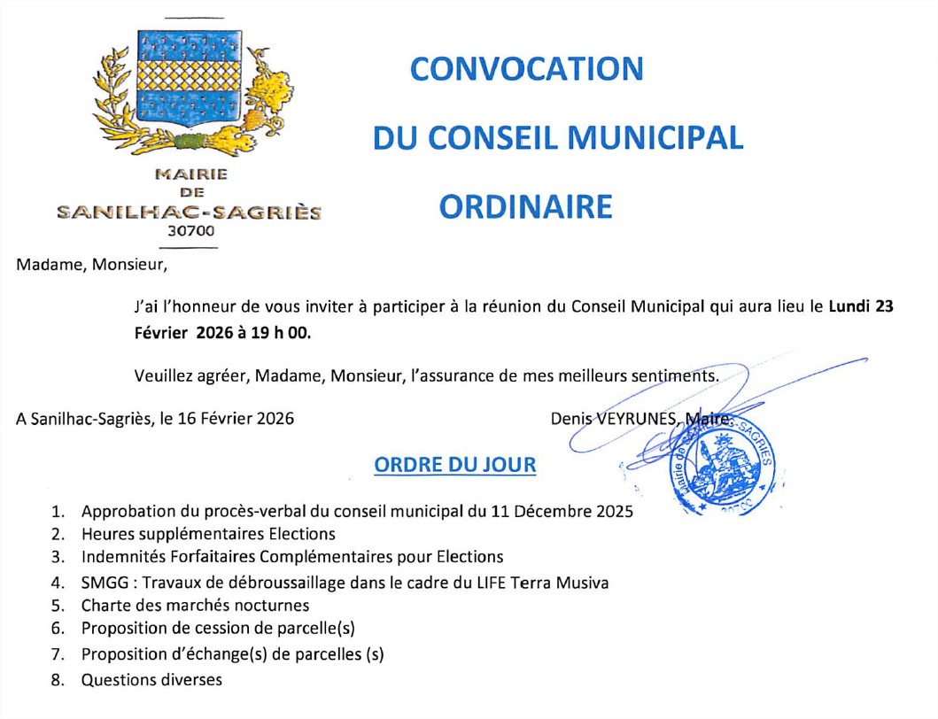 Convocation au Conseil Municipal ordinaire du lundi 23 février 2026 par Julien Cuny | Fév 23, 2026 | Actu à la une, Convocation CM, les conseils municipaux, Mairie 2026 Convocation Conseil Municipal du 23.02.2026 a 19 h 00